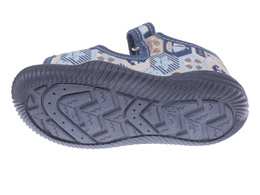 Children's sneakers from the Viggami company. They are navy blue with an interesting print. This model is modeled on sandals and has an insole made of natural leather. They are fastened with velcro and their sole prevents slipping. These shoes are made of high-quality textile materials, they are light, comfortable and practical. They are perfect for school, kindergarten or playing in the garden. Children's sneakers are available in sizes 19-25 in our warehouse.