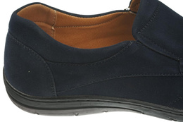Men's loafers from the Badoxx company. They are navy blue with sewn. The shoes are solidly made of high-quality eco suede leather. They have a thick, rubber sole. This model is very light and comfortable because it has a natural leather insert. These shoes are available in sizes 40-45 in our warehouse.