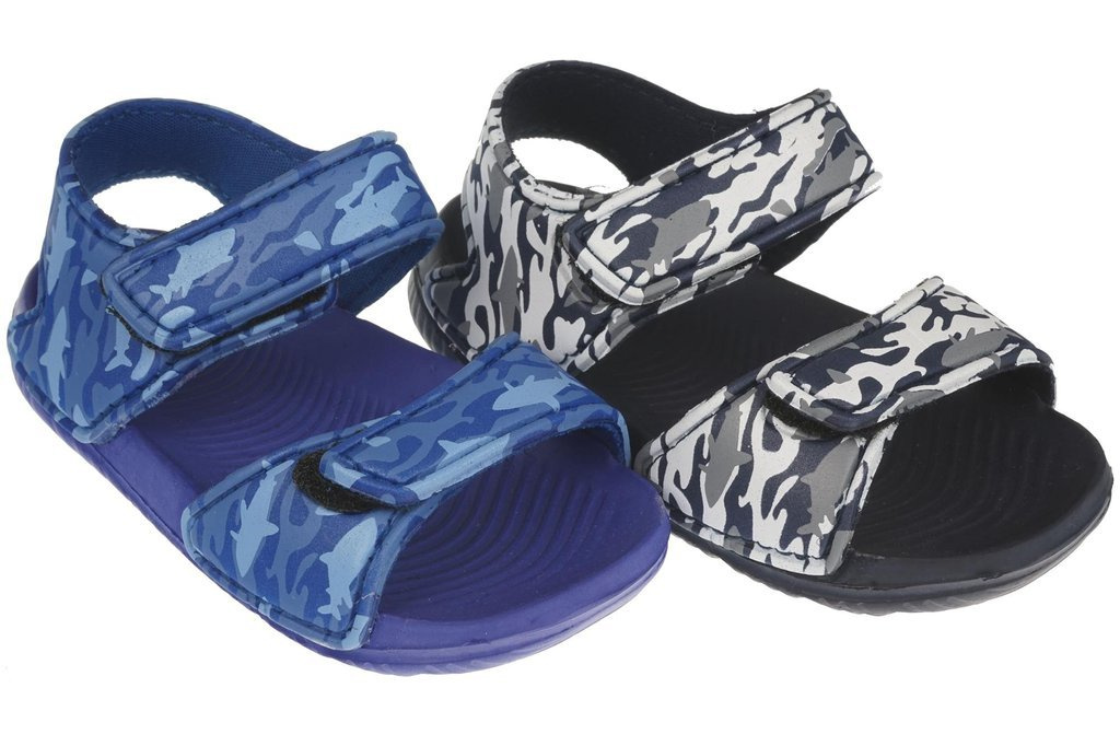Children's pool slippers from the Emaks company. They are available in two colors - navy blue or blue in a camo pattern which is a great choice for boys. Velcro allows for a perfect fit of the footwear to the foot and prevents it from slipping. They are made reliably and carefully from very light foam similar to sandals. They are perfect for the garden, swimming pool or at the seaside. Children's pool slippers are available in sizes 24-29 in our warehouse.