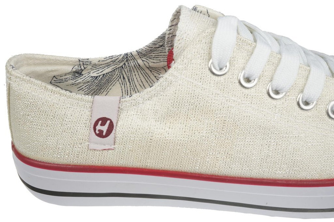 Women's trainers from the SeaStar company. Shoes in beige color with a glitter finish that shimmers beautifully in the light. They are mounted on a rubber sole to prevent slipping. The soft insole ensures high comfort during use. Sneakers are light and very comfortable, they look great on the leg and match everything. They will be perfect for everyday use, but also perfect as school shoes. Rubber fronts ensure longer durability of the product. The laces ensure a perfect fit for each foot. Women's trainers are available in sizes 36-41 in our warehouse.