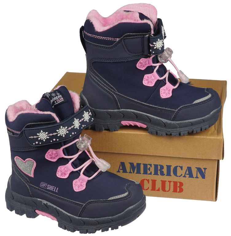 Children's winter shoes from American Club company. They are available in two colors - gray or navy blue. They have a SOFTSHELL upper that protects the foot against rain, wind and low temperature. A thick sole with a tread prevents the shoes from slipping and is adhesive to the ground. The inside of the shoe is insulated, which makes them perfect for winter days. Thanks to the welt and Velcro, we can perfectly match the footwear to each foot. They also make dressing and taking off easier. The shoes are also equipped with a waterproof TRIPLETEX membrane. Shoes will be a perfect complement to winter outfits for girls. Children's winter shoes are available in sizes 27-31 in our warehouse.
