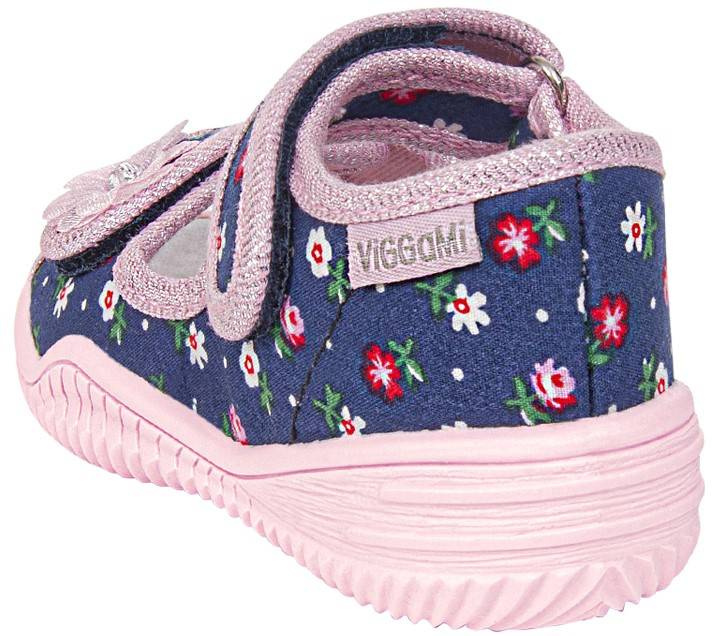 Children's sneakers from the Viggami company. They are navy blue with a beautiful floral print on a pink poach. This model is modeled on sandals and has an insole made of natural leather. They are fastened with Velcro and their sole prevents slipping. These shoes are made of high-quality textile materials. They are perfect for school, kindergarten or playing in the garden. Children's sneakers are available in our warehouse in sizes 20-25.