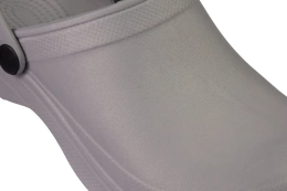 Women’s pool clogs by Flame, Crocs-style, in light grey, are practical and durable footwear designed for comfort and functionality. The closed-toe front effectively protects the toes, while the solid one-piece construction made from high-quality material ensures strength and long-lasting wear. The neutral light grey color makes this model suitable for a variety of situations—both for home use and outdoor activities.