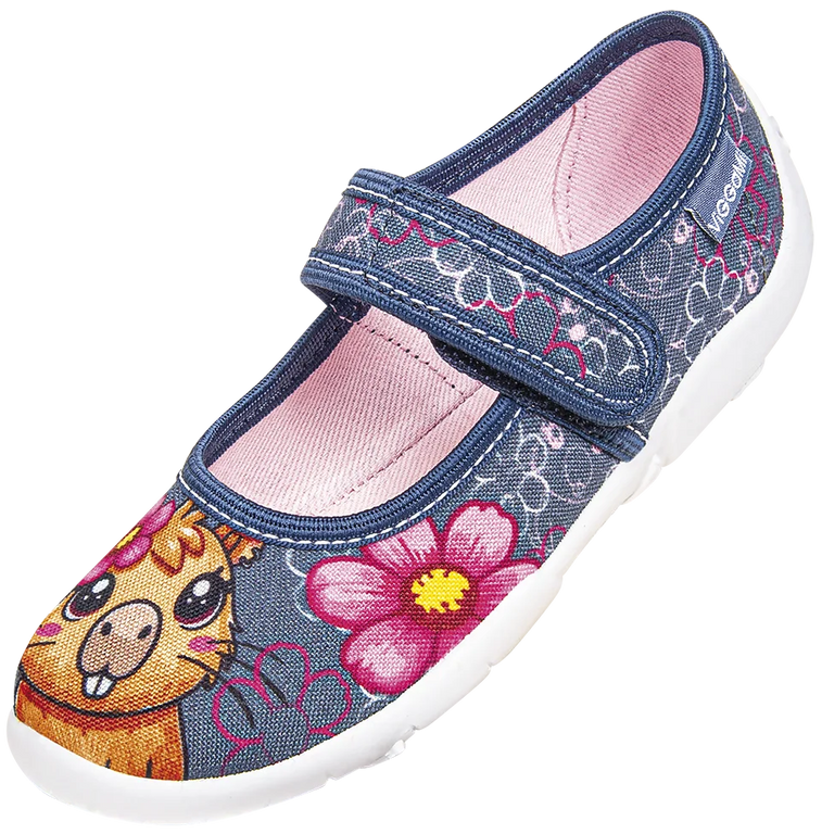 Navy children’s sneakers by Viggami with floral decoration and a squirrel motif combine stylish design, comfort, and high-quality craftsmanship. The fashionable color scheme and decorative print give the shoes a girly character, perfect for everyday outfits. The model is designed for intensive use in preschool, school, and during active play.
