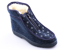 Bambosze damskie firmy Skarpol w pięknym granatowym kolorze w drobne gwiazdki na całej powierzchni. Wykonane zostały z wysokiej jakości filcu, który świetnie zatrzymuje ciepło. Model ten posiada wewnątrz bardzo miękki i ciepły kożuch wełniany, pozwala on na utrzymanie ciepła nawet podczas niskich temperatur. Zamek wszyty w cholewkę ułatwia zakładanie jak i ściąganie bamboszy. Gumowa podeszwa zapobiega poślizgowi oraz zapewnia przyczepność do podłoża. Bambosze Skarpol idealnie sprawdzą się na chłodne dni, sięgają do kostki, są lekkie i wygodne, dostępne są w naszej hurtowni w rozmiarach 36-41.