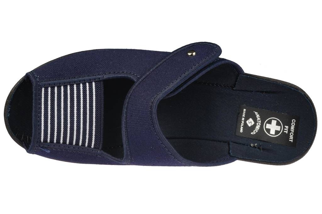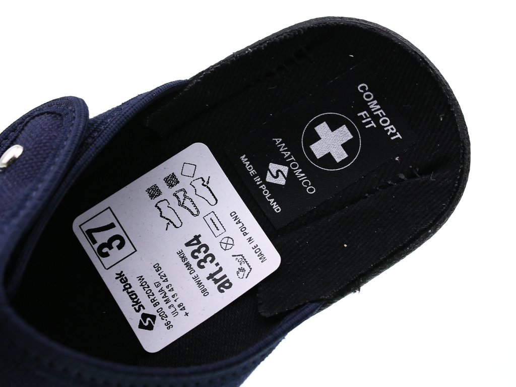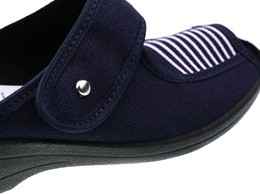 Pantofle tekstylne damskie firmy Skarbek w kolorze granatowym. Wykonane zostały bardzo solidnie i starannie z wysokiej jakości materiałów tekstylnych. Posiadają otwarty nosek, który zapewnia świetną wentylacje. Osadzone zostały na niskim obcasie klockowym, dodaje on centymetrów kilka centymetrów a przy tym jest wygodny. Podeszwa została zaprojektowana tak aby zapobiegała poślizgowi. Pantofle dostępne są w rozmiarach 36-41.