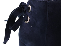 Buty zimowe damskie firmy Sergio Leone w pięknym kolorze granatowym. Wykonane zostały w bardzo ładnym i eleganckim designie w całości ze skóry ekologicznej zamszowej. Posiadają ozdobne wiązanie z tyłu buta w postaci zamszowej wstążki. Migdałowy nosek i obcas słupkowy sprawiają że buty wyglądają bardzo elegancko i efektownie a ocieplenie gwarantuje uczucie ciepła podczas zimnych dni. Buty zapinane są na zamek co bardzo ułatwia ich zakładanie. Dostępne są w rozmiarach 36-41.