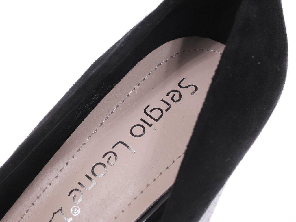 Eleganckie czółenka damskie Sergio Leone w kolorze czarnym to połączenie stylu, wygody i nowoczesnego designu. Zamszowe wykończenie, które jest jednym z najmodniejszych trendów ostatnich sezonów, dodaje butom wyjątkowego charakteru. Klasyczna czerń sprawia, że obuwie doskonale komponuje się z różnorodnymi stylizacjami – zarówno eleganckimi, jak i codziennymi. Dzięki starannemu wykonaniu oraz zastosowaniu wysokiej jakości materiałów model ten spełnia oczekiwania nawet najbardziej wymagających kobiet.