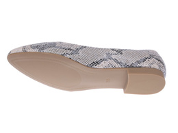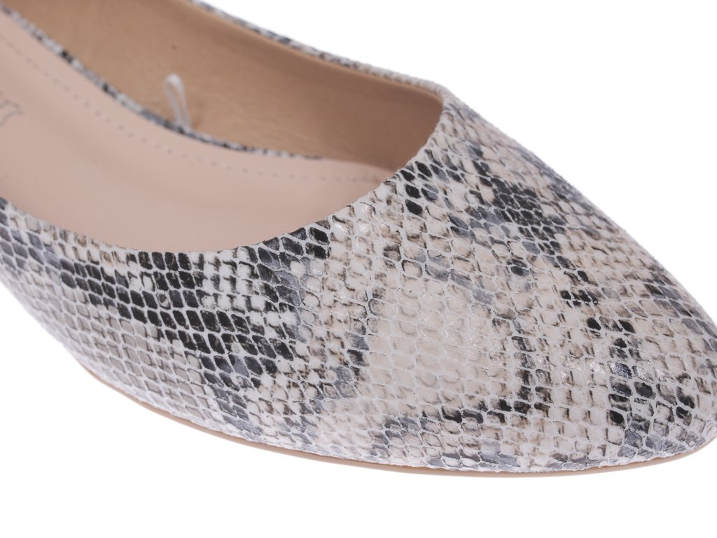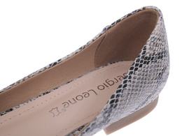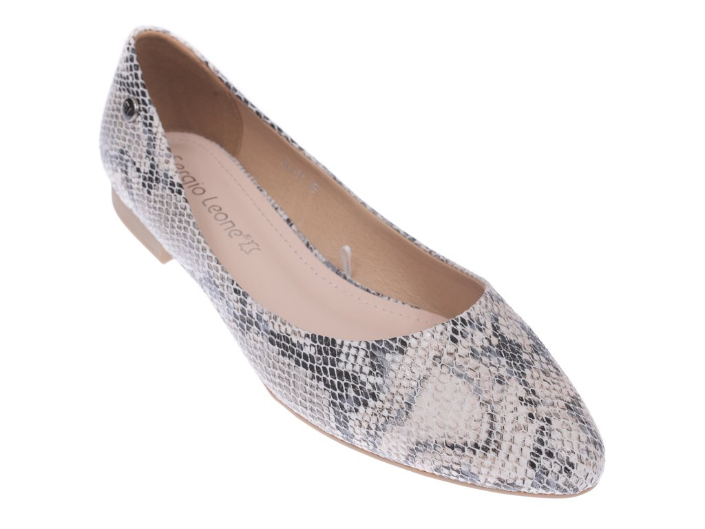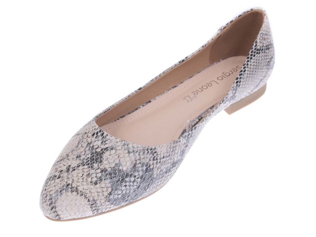 Białe baleriny damskie marki Sergio Leone z modnym wężowym wzorem to eleganckie obuwie, które łączy klasykę z nowoczesnym designem. Wykonane z wysokiej jakości skóry ekologicznej, wyróżniają się subtelną kolorystyką i stylowym zwierzęcym motywem, który podkreśla ich unikalny charakter. Starannie dopracowane detale sprawiają, że model ten doskonale wpisuje się w aktualne trendy modowe.