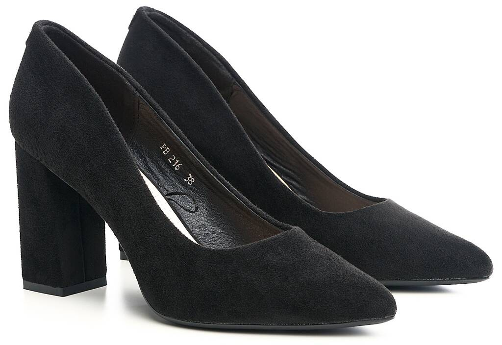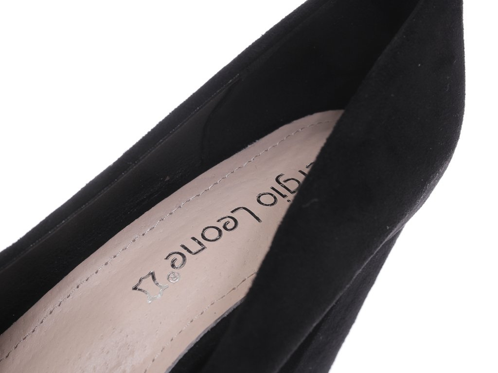 Czółenka damskie firmy Sergio Leone w kolorze czarnym. Wykonane zostały z bardzo modnego materiału w tym sezonie jakim jest zamsz. Buty są osadzone na obcasie klockowym, który jest wygodniejszy od standardowej szpilki, wygląda jednak równie efektownie. Półbuty te posiadają migdałowy nosek, który sprawia że noga wygląda szczuplej. Skórzana wkładka zapewnia ogromny komfort podczas chodzenia, dodatkowo buty są bardzo lekkie a ich podeszwa zapobiega ślizganiu się. Czółenka te idealnie sprawdzą się na wszelkiego rodzaju imprezy i specjalne wyjścia. Dostępne są w rozmiarach 36-40.