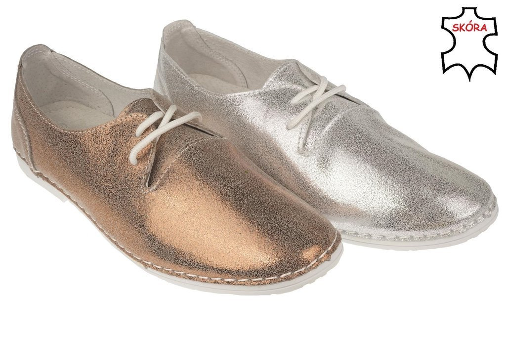 Półbuty damskie firmy American Club dostępne w dwóch eleganckich kolorach – srebrnym i złotym – to doskonały wybór dla kobiet ceniących modny wygląd i komfort na co dzień. Wykonane z najwyższej jakości skóry naturalnej, te wyjątkowe buty wyróżniają się subtelnym brokatowym wykończeniem, które nadaje im unikalnego charakteru. Solidne wykonanie i staranność w każdym detalu gwarantują ich trwałość oraz wygodę użytkowania przez długi czas.