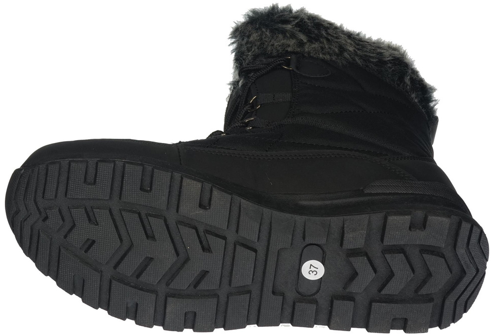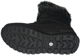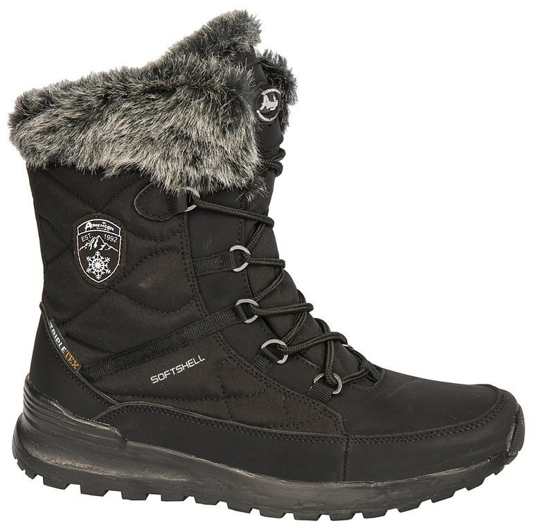 Buty zimowe damskie firmy American Club w kolorze czarnym z ozdobnym futerkiem po zewnętrznej stronie. Solidne i staranne wykonanie z najwyższej jakości materiałów zapewnia długotrwałe użytkowanie tego obuwia. Posiadają one cholewkę Softshell, która chroni stopę przed zimnym wiatrem, deszczem i niską temperaturą. Ich podeszwy zaprojektowane zostały tak aby nie ślizgały się na mokrych posadzkach, zapewniają one stabilność i przyczepność do podłoża. Buty te są lekkie i bardzo wygodne, środek został ocieplony polarem a wiązanie pozwala na idealne dopasowanie butów do stopy. Dostępne są one w rozmiarach 37-41.
