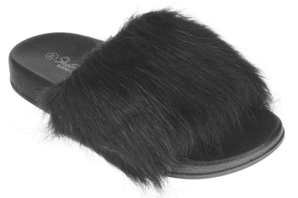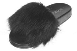 Czarne futerko nadaje obuwiu nowoczesnego i eleganckiego charakteru, dzięki czemu klapki doskonale komponują się z różnorodnymi stylizacjami. Gruba, piankowa podeszwa amortyzuje stopę, zwiększając komfort nawet podczas dłuższego noszenia. Model łączy w sobie modne wykończenie z praktycznym designem, co sprawia, że jest uniwersalnym dodatkiem do każdej garderoby.