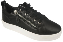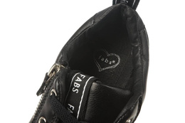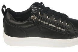 Tenisówki damskie firmy Fabs w kolorze czarnym z ozdobnym zamkiem, który ułatwia również zakładanie. Osadzone zostały na grubej, gumowej podeszwie, która zapobiega poślizgowi. Wykonane zostały bardzo solidnie i starannie z wysokiej jakości skóry ekologicznej w ładnym i ciekawym stylu, dość eleganckim, odpowiednim jednak do codziennego użytku. Wnętrze zostało stworzone z miękkiego materiału tekstylnego zaś wkładka ze skóry ekologicznej. Buty te idealnie sprawdzą się do codziennego użytku, jako obuwie do pracy lub szkoły. Wiązanie umożliwia idealne dopasowanie obuwia do każdej stopy. Model ten dostępny jest w naszej hurtowni w rozmiarach 36-41.