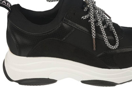 Tenisówki damskie firmy Fabs w kolorze czarnym osadzone na grubej podeszwie wykonanej w bardzo modnym w ostatnim czasie stylu. Nadaje one niepowtarzalnego charakteru, sprawia wrażenie masywnej i ciężkiej, stworzona została jednak z pianki co jest wielką zaletą gdyż buty te są lekkie. Cholewka wykonana została bardzo solidnie i starannie z wysokiej jakości skóry ekologicznej w ładnym i ciekawym stylu, dość eleganckim, odpowiednim jednak do codziennego użytku. Wnętrze zostało stworzone zaś z miękkiego materiału tekstylnego a wkładka ze skóry ekologicznej. Buty te idealnie sprawdzą się do codziennego użytku, świetnie uzupełnią nie jedną stylizację. Wiązanie umożliwia idealne dopasowanie obuwia do każdej stopy. Model ten dostępny jest w naszej hurtowni w rozmiarach 36-41.