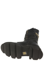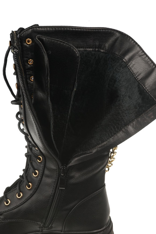 Świetne buty zimowe damskie SeaStar w kolorze czarnym. Wykonane w bardzo modnym designie z wytrzymałej skóry ekologicznej. Ich podeszwy nie tylko wyglądają świetnie ale również chronią stopę przed ślizganiem. Obuwie zostało obszyte futrem, które zapewnia ciepło podczas zimowych lub jesiennych dni. Mimo swojego topornego wyglądu obuwie nie jest ciężkie. Mimo iż są wiązane, to dodatkowo został wszyty zamek w cholewkę dla większego komfortu zakładania. Są doskonałym uzupełnieniem jesiennych kreacji, a ich wzór jest hitem sprzedażowym tego sezonu. Dostępne są w rozmiarach 36-41.