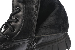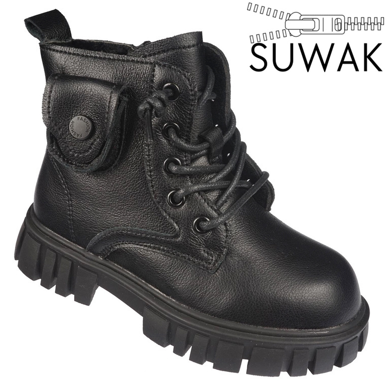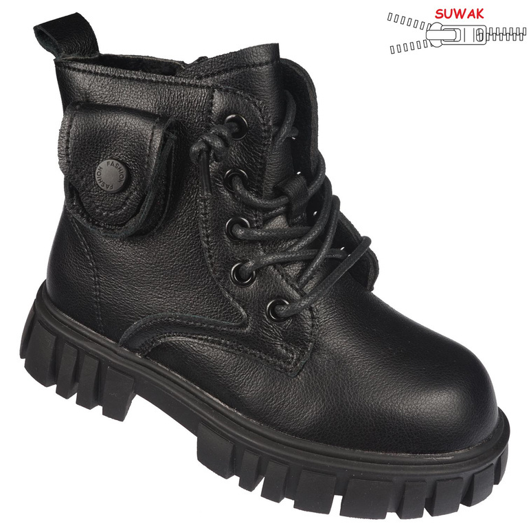 Obuwie zimowe dziecięce firmy Apawwa w kolorze czarnym. Wykonane zostały solidnie i starannie z wysokiej jakości skóry ekologicznej w bardzo ładnym designie, klasycznym ale niebanalnym, idealnym do codziennych jak i wyjściowych stylizacji. Model ten osadzony został na grubej, gumowej podeszwie z bieżnikiem która, zabezpiecza przed poślizgiem oraz gwarantuje przyczepność do podłoża. Wewnątrz znajduję się kożuch, który zapewnia ciepło podczas zimnych dni zaś zamek ułatwia i przyspiesza zakładanie obuwia. Buty zimowe dziecięce Apawwa dostępne są w naszej hurtowni w rozmiarach 26-31.