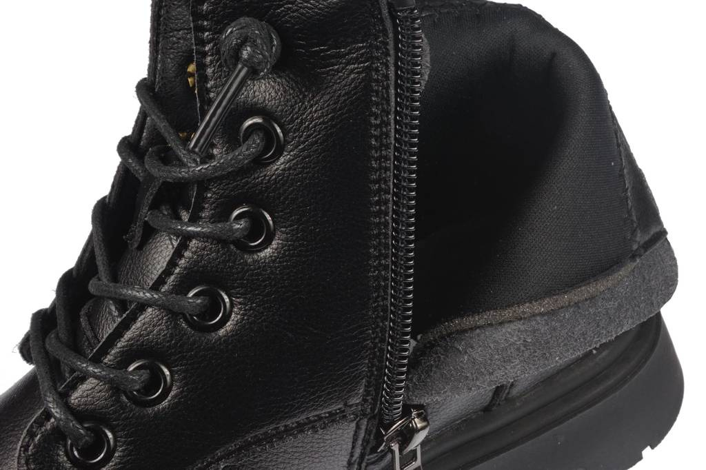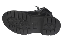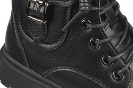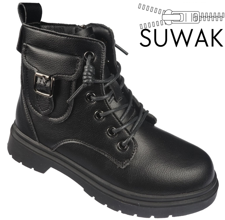 Piękne buty przejściowe dziecięce firmy Apawwa w kolorze czarnym z imitacją saszetki na cholewce. Obuwie wykonane zostało bardzo starannie i solidnie z najlepszej jakości materiałów na wzór glanów. Ich podeszwy wyglądają na masywne i ciężkie jednak wykonane zostały z lekkich materiałów co sprawia że model ten jest wygodny podczas użytkowania. Wewnątrz znajdziemy polar, który chroni stopę przed niskimi temperaturami i miękka wkładkę która sprawia, że obuwie jest bardzo wygodne. Model ten wyposażony został w zapięcie na zamek od wewnętrznej strony, ułatwia to i przyśpiesza zakładanie obuwia. Nasza hurtownia obuwia posiada ten model w rozmiarach 32-40. Model ten został stworzony w nietypowej, długiej rozmiarów. Pozwala ona na zakup takiego samego obuwia dla mamy i córki.