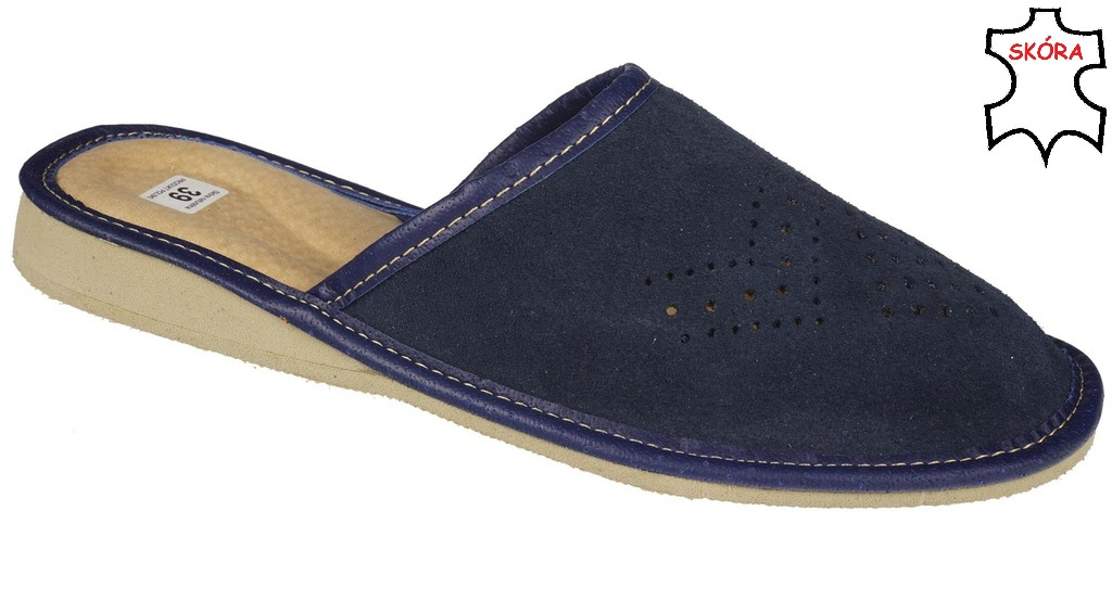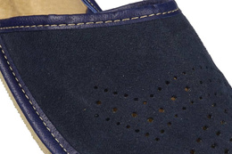Pantofle góralskie damskie firmy Pako w pięknym granatowym kolorze z ozdobnym dziurkowaniem. Stworzone zostały one solidnie i starannie w bardzo ładnym, kobiecym stylu ze skóry naturalnej zamszowej. Wewnątrz posiadają miękką wkładkę ze skóry naturalnej, gwarantuje ona maksymalny komfort podczas użytkowania. Ich podeszwy zapobiegają poślizgowi. Pantofle góralskie damskie Pako są bardzo lekkie, praktycznie nic nie ważą, są również bardzo wygodne i praktyczne. Idealnie sprawdzą się jako obuwie domowe. Dostępne są w naszej hurtowni w rozmiarach 36-41.