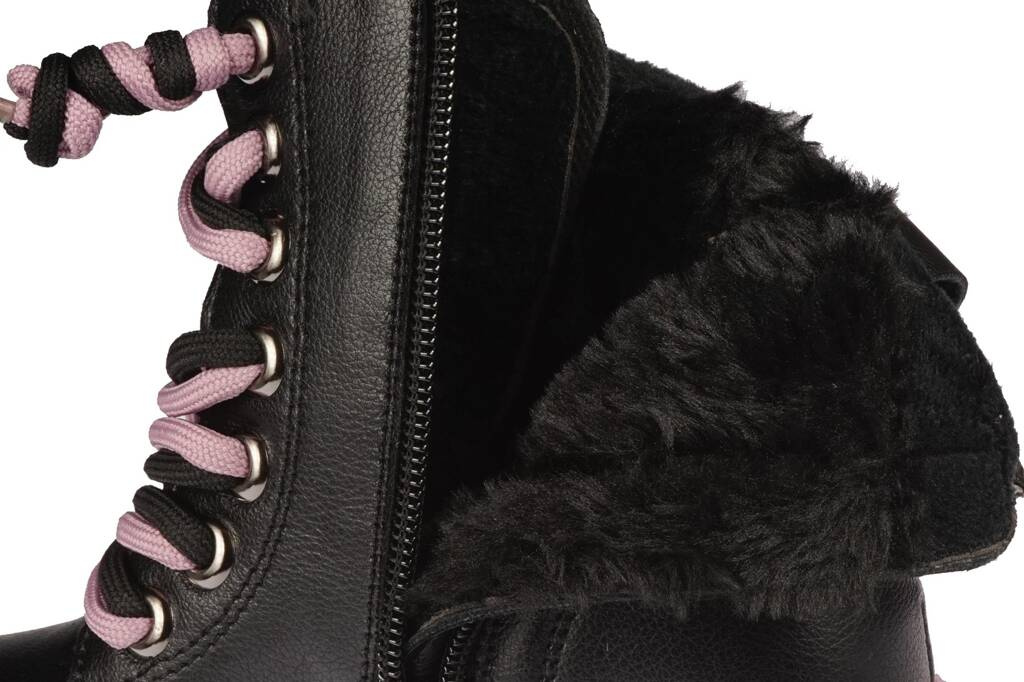 Piękne buty zimowe dziecięce firmy Apawwa w kolorze czarnym na fioletowej, grubej podeszwie, bardzo modnej w tym sezonie. Wykonane zostały na wzór glanów z bardzo dobrej jakości materiałów. Ich podeszwy wyglądają na masywne i ciężkie jednak wykonane zostały z lekkich materiałów co sprawia że model ten jest wygodny podczas użytkowania. Bieżnik zapobiega poślizgowi a kolorowe sznurówki dodają całości ciekawego charakteru. Miękki kożuch wewnątrz chroni stopę przed niskimi temperaturami a miękka wkładka zapewnia wysoki komfort podczas użytkowania. Model ten wyposażony został w zapięcie na zamek od wewnętrznej strony, ułatwia to i przyśpiesza zakładanie obuwia. Nasza hurtownia obuwia posiada ten model w rozmiarach 32-37.