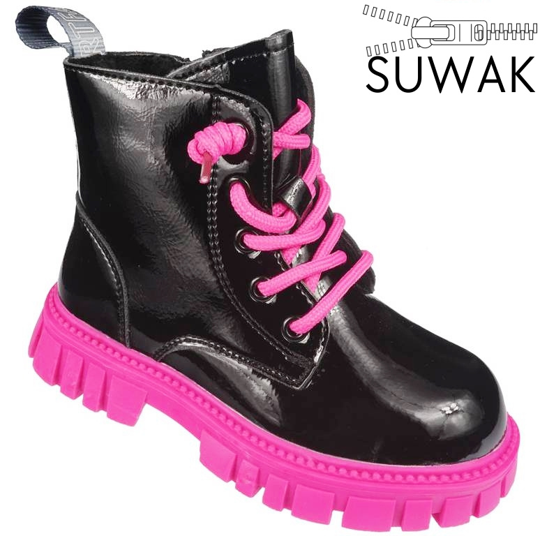 Piękne buty zimowe dziecięce firmy Apawwa w kolorze czarnym na różowej, grubej podeszwie, bardzo modnej w tym sezonie. Wykonane zostały na wzór glanów z bardzo dobrej jakości materiałów. Ich podeszwy wyglądają na masywne i ciężkie jednak wykonane zostały z lekkich materiałów co sprawia że model ten jest wygodny podczas użytkowania. Bieżnik zapobiega poślizgowi a kolorowe sznurówki dodają całości ciekawego charakteru. Miękki kożuch wewnątrz chroni stopę przed niskimi temperaturami a miękka wkładka zapewnia wysoki komfort podczas użytkowania. Model ten wyposażony został w zapięcie na zamek od wewnętrznej strony, ułatwia to i przyśpiesza zakładanie obuwia. Nasza hurtownia obuwia posiada ten model w rozmiarach 32-37.