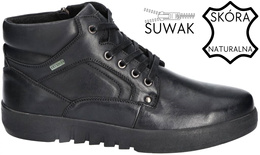 Obuwie przejściowe męskie firmy American Club w kolorze czarnym i camelowym. Obuwie za kostkę zostało wykonane ze skóry naturalnej, która chroni przed wiatrem i deszczem oraz jest wytrzymała. Dodatkowo obuwie posiada miękką ocieplaną wkładkę, który chroni stopę przed niską temperaturą. Połączenie to sprawia, że produkt ten jest idealnym wyborem na zimne i deszczowe dnie. Buty przejściowe posiadają grubą podeszwę gumową co sprawia, że są bardzo przyczepne do podłoża i nie ślizgają się. Kolejną zaletą jest zamek który ułatwia zakładanie. Dodatkowo sznurówki pozwalają na idealne dopasowanie oraz urozmaicają prostą konstrukcję. Idealnie sprawdzą się w sezonie zimowym i jesiennym. Obuwie pasuje nie tylko do codziennych sytuacji, ale również dopasuje się do bardziej eleganckich stylizacji. Buty męskie American Club dostępne w rozmiarach 41-45.