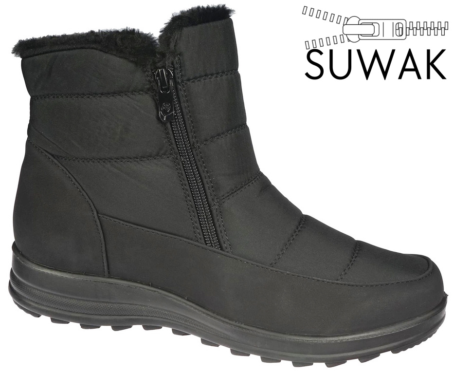 Śniegowce damskie firmy Feisal w klasycznym czarnym kolorze. Obuwie zostało wykonane z myślą o kobietach, które cenią sobie nowy krzyk mody. Wykonane są z połączenia ortalionu, gumy i futra w bardzo ciekawym stylu. Model ten będzie odpowiedni nie tylko do codziennego użytku ale również świetnie sprawdzi się do tych eleganckich stylizacji. Ocieplany środek gwarantuje uczucie ciepła nawet podczas minusowych temperatur. Buty Feisal świetnie leżą na nodze, są wytrzymałe i bardzo wygodne, posiadają zamek który umożliwia łatwe i szybkie zakładanie. Buty zimowe Skotnicki dostępne są w naszej hurtowni w rozmiarach 39-43.
