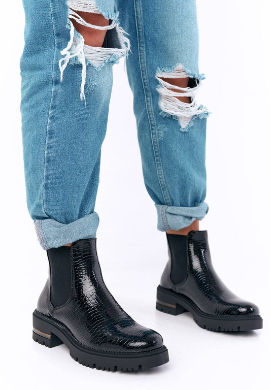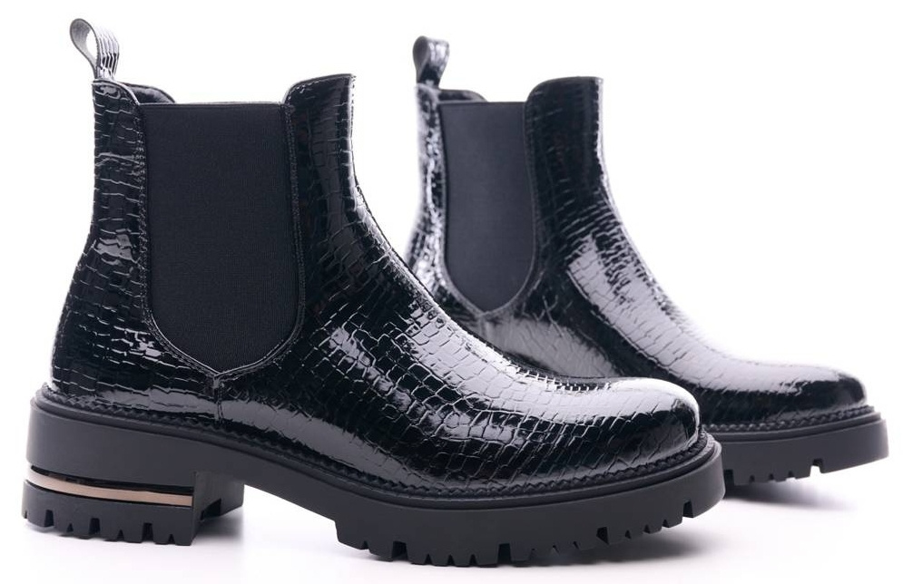 Sztyblety damskie firmy Sergio Leone w klasycznym czarnym kolorze. Cholewka została wykonana z najlepszej jakości skóry ekologicznej w pięknym lakierowanym wzorze. W cholewkę zostały wszyte elastyczne gumki po obu stronach, które mają za zadanie ułatwić ubieranie i ściganie obuwia. Sztyblety zostały obszyte w środku ciepłym i miękkim kożuchem, który zatrzymuje ciepło i chroni stopę przed zimnem. Gruba, gumowa podeszwa na obcasie zapobiegnie ślizganiu. Obuwie Sergio Leone będą idealnym dodatkiem do jesiennej garderoby. Dostępne są w rozmiarach od 36-40.