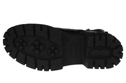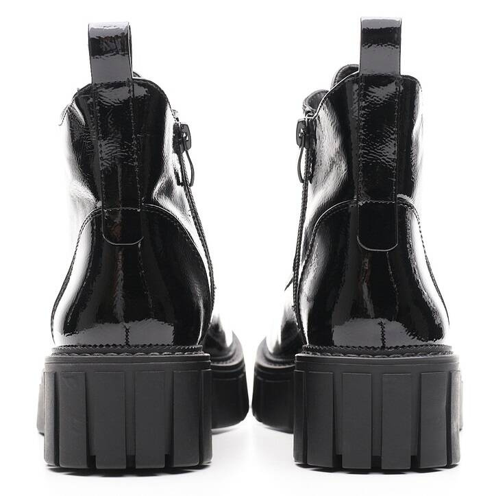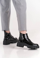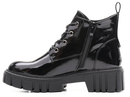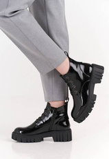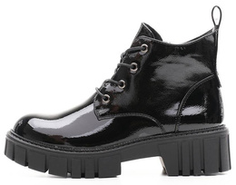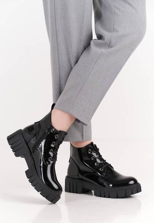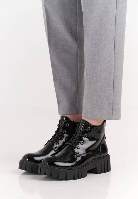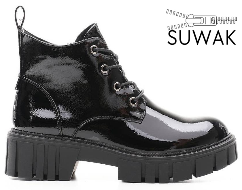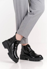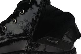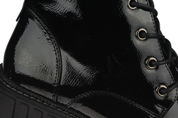 Trapery damskie firmy Sergio Leone w czarnym kolorze z lakierowanym wykończeniem. Cholewka obuwia została wykonana bardzo solidnie z wysokiej jakości skóry ekologicznej w modnym designie. Model ten posiada wiązanie oraz zapięcie na zamek co ułatwia i przyśpiesza zakładanie. Środek wyposażony został w ocieplacz jakim jest miękki i przyjemny w dotyku polar. Model ten będzie pasował idealnie do sukienek ale również świetnie skomponuje się ze spodniami. Chropowata podeszwa zapobiega poślizgowi a miękka wkładka zapewnia wygodę podczas użytkowania. Buty damskie Sergio Leone znajdują się one w naszej hurtowni w rozmiarach 36-41.