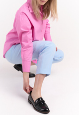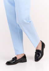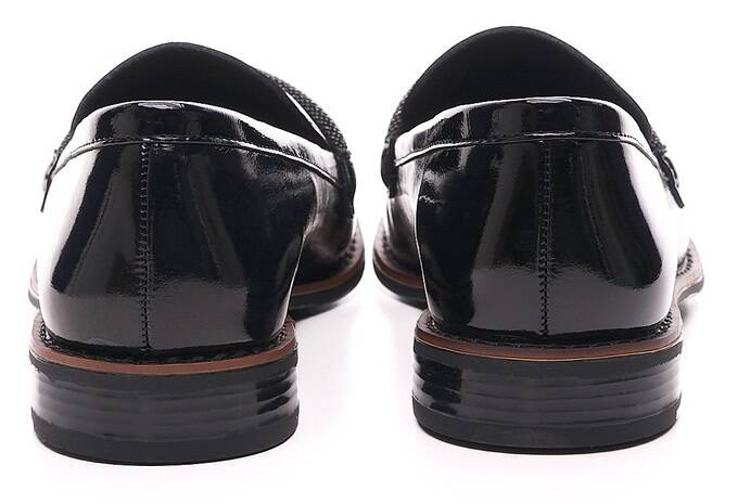 Uniwersalny czarny kolor i eleganckie lakierowane wykończenie sprawiają, że mokasyny świetnie komponują się zarówno z klasycznymi spodniami materiałowymi, jak i jeansami, spódnicami czy sukienkami. Doskonałe jako uzupełnienie stylizacji biznesowej, wieczorowej lub codziennej. Dostępne w hurtowni obuwia w rozmiarach 36-41.