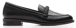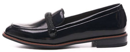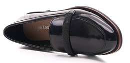 Czarne mokasyny damskie to doskonałe połączenie klasyki, elegancji i nowoczesnego designu. Lakierowana skóra ekologiczna nadaje obuwiu wyjątkowego blasku, podkreślając jego ekskluzywny charakter. Ozdobny pasek z cekinami na przodzie dodaje subtelnego uroku, czyniąc model idealnym wyborem zarówno na co dzień, jak i na specjalne okazje. Stylowy wygląd sprawia, że mokasyny świetnie komponują się z eleganckimi, jak i bardziej casualowymi stylizacjami.