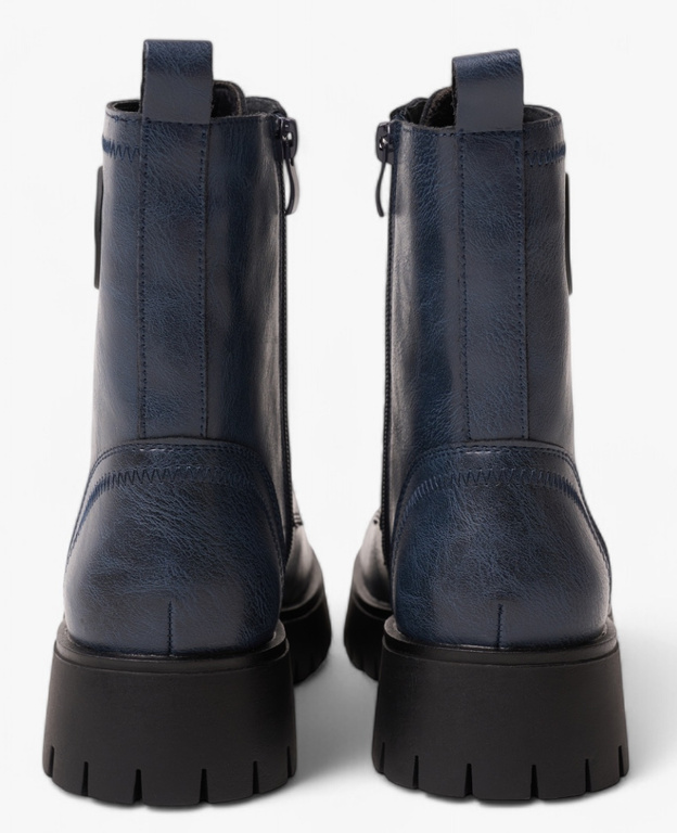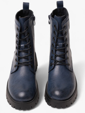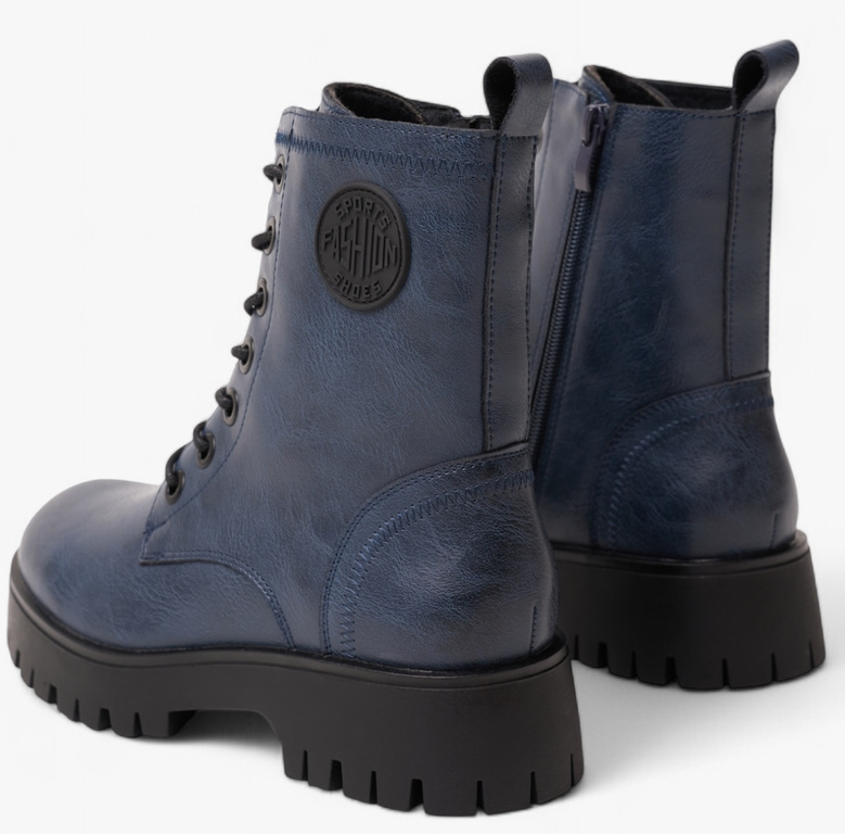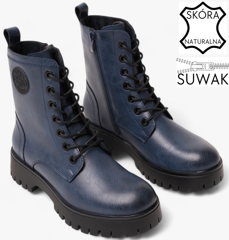 Trapery damskie firmy Sergio Leone w nietypowym granatowym kolorze z ozdobną naszywką z boku. Model ten został wykonany z wysokogatunkowej skóry naturalnej w świetnym stylu na podobieństwo glanów. Model ten posiada wiązanie oraz zapięcie na zamek co ułatwia i przyśpiesza zakładanie. Środek został obszyty bardzo ciepłym polarem, który jest miękki i przyjemny w dotyku polar. Model ten będzie pasował idealnie do sukienek ale również świetnie skomponuje się ze spodniami. Chropowata podeszwa zapobiega poślizgowi a miękka wkładka zapewnia wygodę podczas użytkowania. Buty damskie Sergio Leone znajdują się one w naszej hurtowni w rozmiarach 36-40.