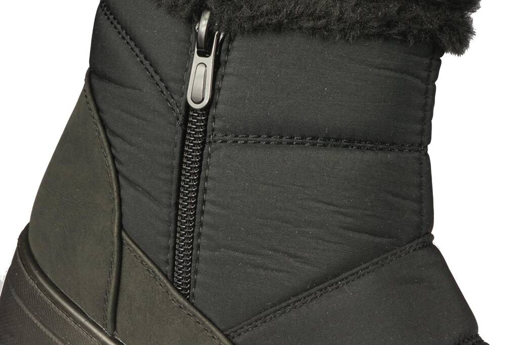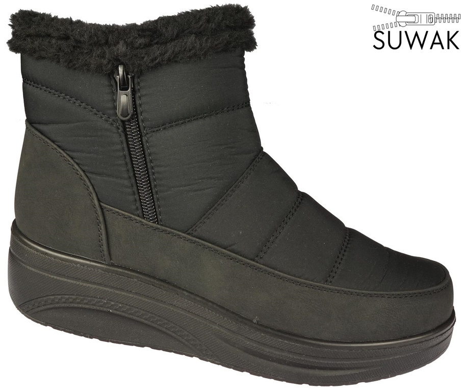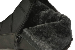 Obuwie zimowe damskie firmy Le Scarpe w klasycznym czarnym kolorze z przeszywaną cholewką. Obuwie zostało wykonane z ortalionu, kobiecym wzorze z ozdobnym zamkiem oraz szarym futerkiem. Podeszwa z bieżnikiem zapewnia wysoką przyczepność do podłoża a miękki kożuch wewnątrz zagwarantuje uczucie ciepła nawet podczas minusowych temperatur. Model ten wyposażony został w zapięcie na zamek, które usprawni proces zakładania obuwia. Buty zimowe Le Scarpe dopasują się do każdego jesienno-zimowego stroju. Dostępne są w naszej hurtowni w rozmiarach 36-41.