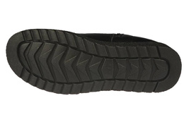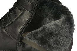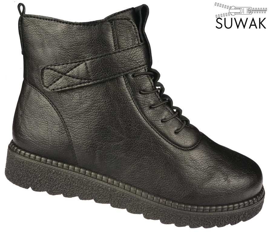 Obuwie zimowe damskie firmy Le Scarpe w klasycznym kolorze czarnym na delikatnym koturnie wykonanym z bardzo lekkiego materiału. Cholewka została wykonana z wysokogatunkowej skóry ekologicznej w ciekawym stylu. Podeszwa z bieżnikiem zapewnia wysoką przyczepność do podłoża a miękki kożuch wewnątrz zagwarantuje uczucie ciepła nawet podczas minusowych temperatur. Model ten wyposażony został w zapięcie na rzep, zamek i ściągacz które usprawni proces zakładania obuwia. Buty zimowe Le Scarpe dopasują się do każdego jesienno-zimowego stroju. Dostępne są w naszej hurtowni w rozmiarach 36-41.