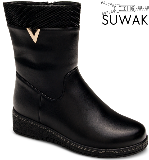 Niskie kozaki damskie firmy Skotnicki w czarnym kolorze z ozdobna klamerką z boku. Wykonane zostały z klasycznym stylu z trwałego materiału jakim jest skóra ekologiczna. Model ten będzie odpowiedni nie tylko do codziennego użytku ale również świetnie sprawdzi się do tych eleganckich stylizacji. Ocieplany środek gwarantuje zaś uczucie ciepła nawet podczas minusowych temperatur. Buty Skotnicki świetnie leżą na nodze, są wytrzymałe i bardzo wygodne, posiadają zamek który umożliwia łatwe i szybkie zakładanie. Dodatkowo buty posiadają wszytą gumę w górnej części, która odpowiada za idealne dopasowanie się obuwia do nogi. Buty zimowe Skotnicki dostępne są w naszej hurtowni w rozmiarach 36-41.
