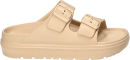 Model wyposażony jest w dwa paski zapinane na klamerkę, które umożliwiają precyzyjne dopasowanie klapek do indywidualnych potrzeb, co zapewnia ich stabilność i komfort. Dodatkowo, nietypowa konstrukcja z grubą podeszwą nadaje klapkom wyjątkowego charakteru, wprowadzając do klasycznego designu elementy modowego stylu. Mimo swojej grubości, podeszwa nie utrudnia poruszania się, zapewniając pełną swobodę i wygodę.