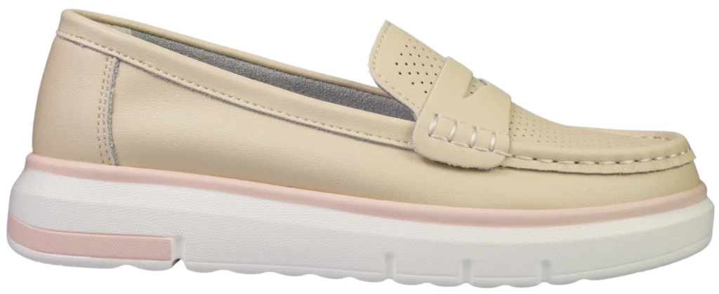 Mokasyny damskie Skotnicki w modnym beżowym kolorze z białą podeszwą i ozdobnym różowym paskiem to połączenie elegancji i wygody w nowoczesnym wydaniu. Wykonane z najwyższej jakości skóry naturalnej, zachwycają starannym wykonaniem i ciekawym designem. Ozdobny łańcuszek na przodzie nadaje obuwiu niepowtarzalnego charakteru, podkreślając jego stylowy wygląd.