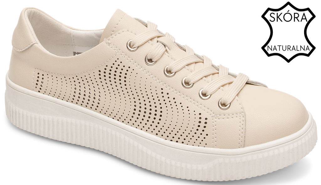 Półbuty sportowe damskie Skotnicki w eleganckim beżowym kolorze to doskonałe obuwie dla osób ceniących wygodę, trwałość i nowoczesny design. Wykonane z wysokiej jakości skóry naturalnej, zachwycają starannym wykończeniem, które podkreśla dbałość o każdy detal. Ażurowa cholewka nadaje lekkości, a jednocześnie zapewnia optymalną cyrkulację powietrza, co przekłada się na wysoki komfort noszenia. Model idealnie sprawdza się w cieplejsze dni, chroniąc przed nadmiernym nagrzewaniem stóp i zapewniając uczucie świeżości przez cały dzień.