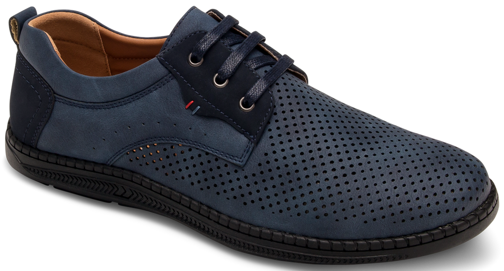 Elegancki migdałowy nosek podkreśla klasyczny wygląd, dodając półbutom wyrafinowanego charakteru. Ozdobne przeszycia wzmacniają konstrukcję, jednocześnie dodając modnego akcentu. Granatowa cholewka w połączeniu z czarną podeszwą to stylowy wybór dla mężczyzn ceniących ponadczasową estetykę i wygodę.