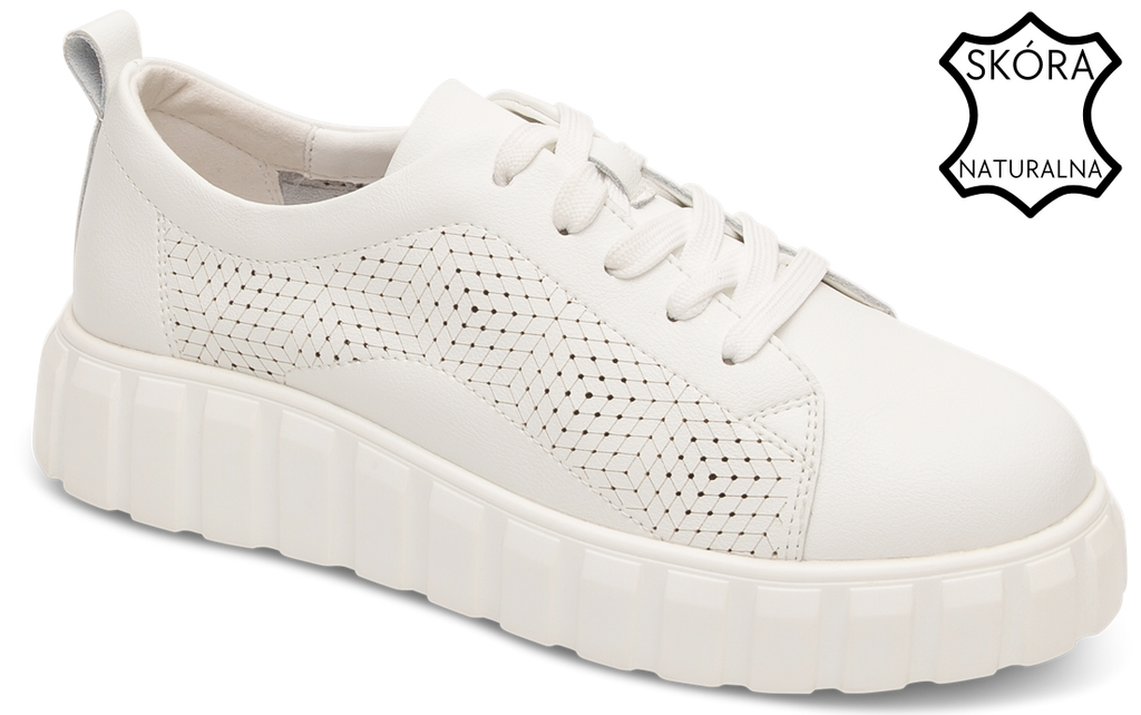 Półbuty sportowe damskie Skotnicki w eleganckim białym kolorze to doskonałe obuwie dla osób ceniących wygodę i nowoczesny design. Wykonane z wysokiej jakości skóry naturalnej, charakteryzują się starannym wykończeniem oraz trwałością. Ażurowa cholewka nie tylko dodaje lekkości i unikalnego wyglądu, ale również zapewnia odpowiednią cyrkulację powietrza, co sprawia, że model ten idealnie nadaje się na cieplejsze dni.