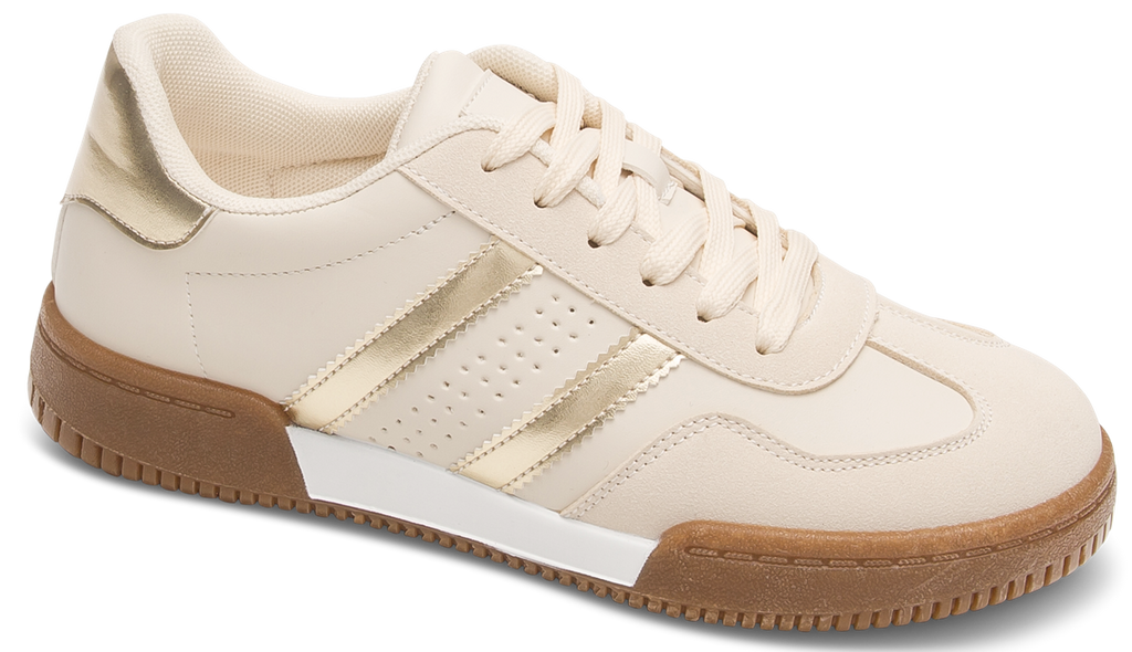 Połączenie beżu i złotych akcentów nadaje butom wyjątkowej elegancji, dzięki czemu doskonale współgrają zarówno ze sportowymi, jak i casualowymi stylizacjami. Uniwersalna kolorystyka pozwala na łatwe dopasowanie do różnorodnych elementów garderoby, takich jak jeansy, legginsy, sukienki czy eleganckie spodnie. Modny, a zarazem subtelny design sprawia, że obuwie świetnie sprawdza się w codziennym użytkowaniu, oferując jednocześnie stylowy i wyrafinowany wygląd. To doskonały wybór dla osób ceniących połączenie wygody z modowym charakterem.