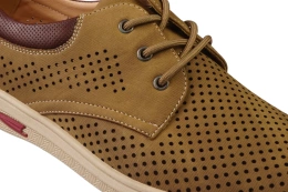 Męskie półbuty Prety w stylowym camelowym kolorze z kontrastującą beżową podeszwą to doskonałe połączenie klasyki z modnym designem. Wykonane z wysokiej jakości skóry ekologicznej, wyróżniają się estetycznym wyglądem oraz starannym wykończeniem. Ozdobne przeszycia nadają im eleganckiego charakteru, a dopracowane detale podkreślają nowoczesny styl, który sprawdzi się w wielu stylizacjach.