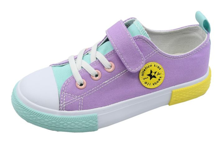 Tenisówki dziecięce Atletico w kolorystyce fioletowo-miętowej to połączenie nowoczesnego designu z funkcjonalnością, odpowiadające aktualnym trendom mody dziecięcej. Okrągła naszywka umieszczona na boku dodaje charakteru i wyróżnia model spośród innych propozycji dostępnych na rynku. Stylowy fason dopasowuje się do różnych zestawień ubioru, sprawdzając się w codziennym użytku oraz przy bardziej okazjonalnych stylizacjach.