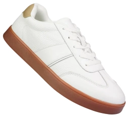 Płaska kauczukowa podeszwa zapewnia skuteczną amortyzację i stabilność, co przekłada się na bezpieczeństwo podczas chodzenia po różnych nawierzchniach. Elastyczny i trwały materiał podeszwy doskonale sprawdza się w miejskich warunkach, oferując komfort nawet przy długotrwałym użytkowaniu. Harmonijne zestawienie bieli, brązu i beżu czyni ten model zgodnym z aktualnymi trendami modowymi.