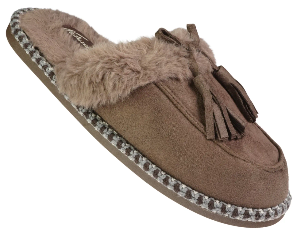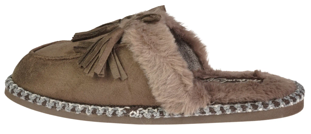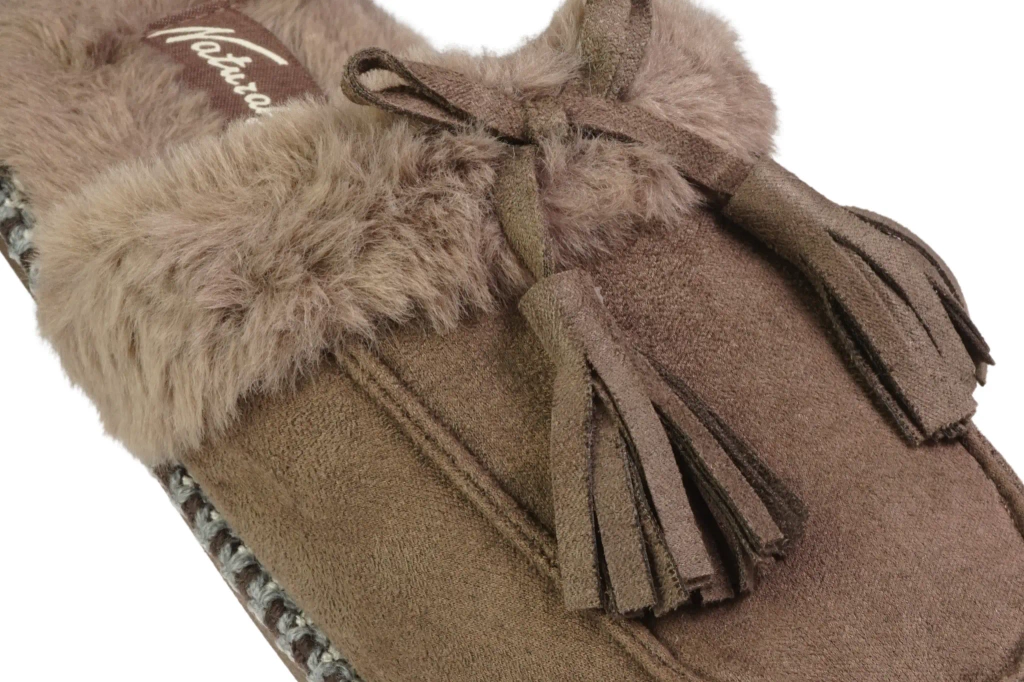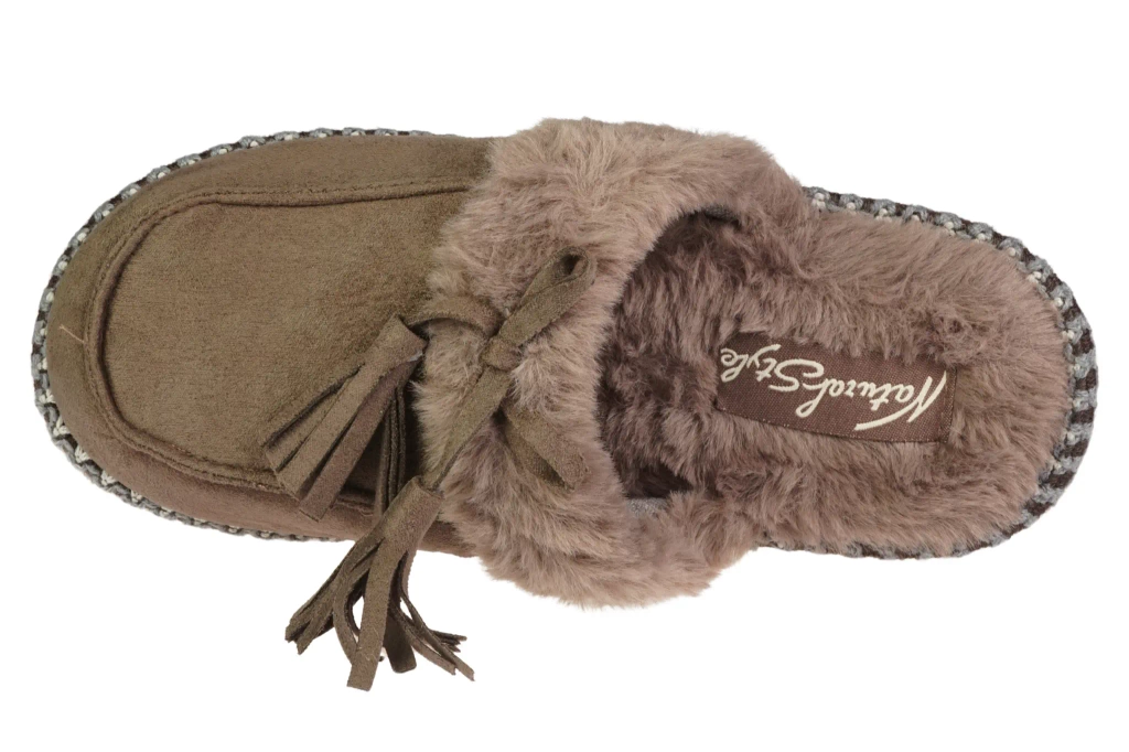 Brązowe pantofle damskie Meteor to połączenie klasycznego fasonu, domowej wygody i stonowanego, eleganckiego stylu. Inspirowany mokasynami krój z dekoracyjnym przeszyciem na przodzie nadaje modelowi subtelnie kobiecego charakteru. Uniwersalny odcień brązu doskonale współgra z domową garderobą, wprowadzając do codziennych stylizacji ciepło i ponadczasową estetykę – idealną na sezon jesienno-zimowy.