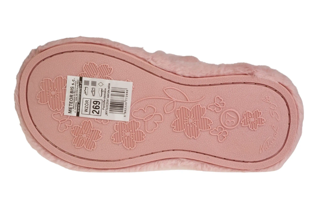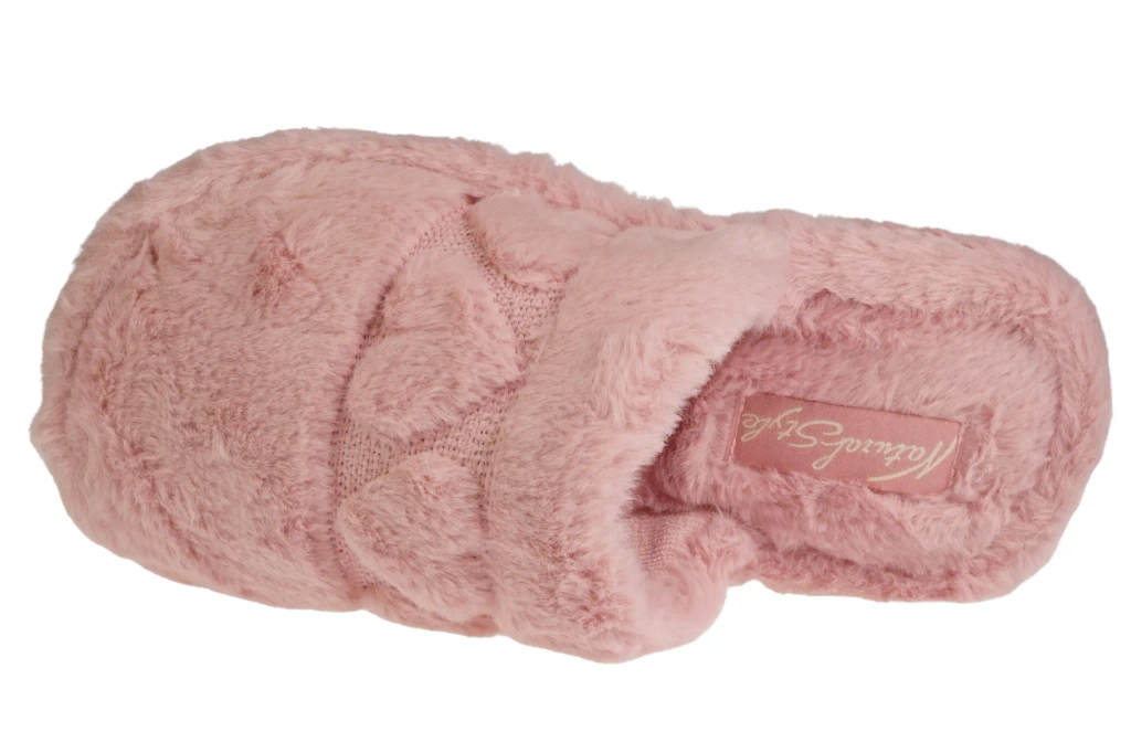 Różowe pantofle damskie Meteor stanowią udane połączenie klasycznego fasonu, przytulnego wykończenia i subtelnych, dekoracyjnych akcentów. Model wyróżnia się zewnętrznym futerkiem oraz uroczymi serduszkami na cholewce, które podkreślają kobiecy i delikatny charakter obuwia. Pastelowy odcień różu doskonale wpisuje się w domowe stylizacje, dodając im ciepła i lekko romantycznego akcentu.