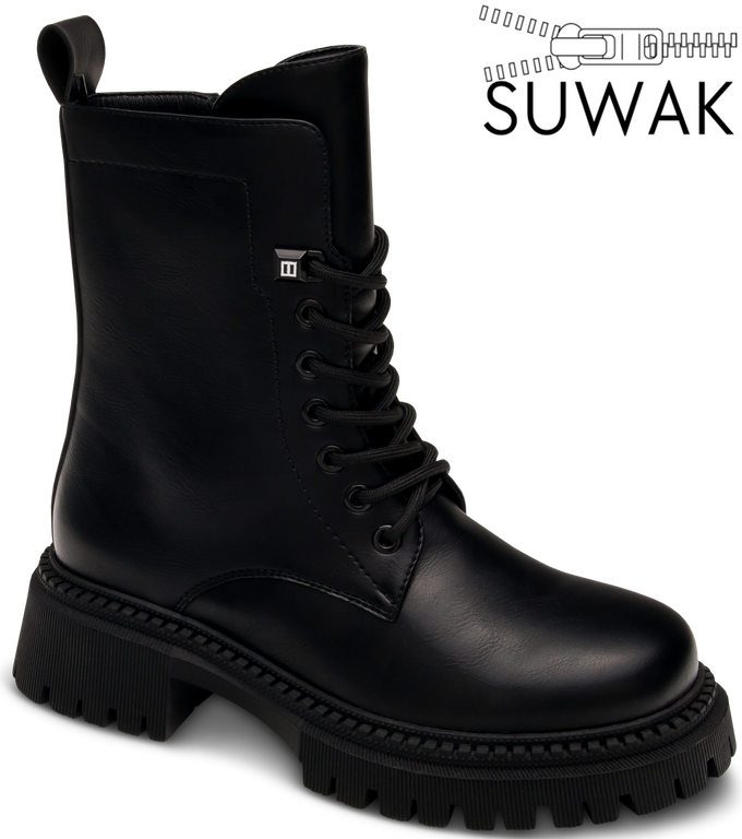 Buty zimowe damskie Skotnicki w klasycznym czarnym kolorze to nowoczesna propozycja inspirowana kultowym stylem glanów. Model osadzony na solidnej, grubej gumowej podeszwie gwarantuje doskonałą przyczepność do podłoża, stabilność oraz komfort noszenia nawet podczas trudnych warunków pogodowych. Wykorzystanie wysokogatunkowej skóry ekologicznej nadaje obuwiu elegancki wygląd, a jednocześnie zapewnia trwałość i odporność na uszkodzenia. Stylowy design w połączeniu z ponadczasową kolorystyką sprawia, że model doskonale komponuje się z różnorodnymi stylizacjami – od casualowych po bardziej eleganckie.