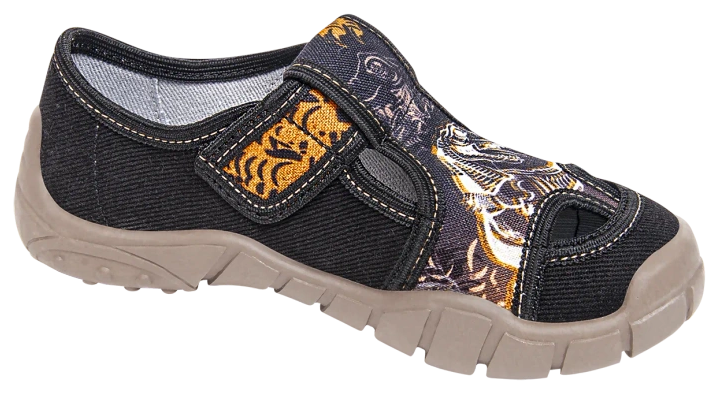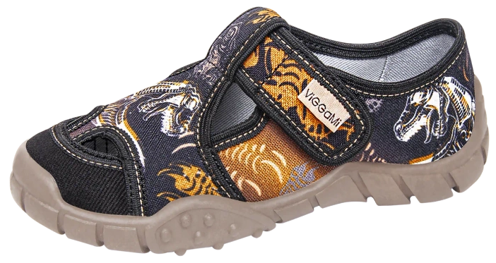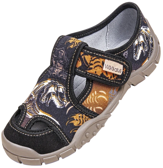 Tenisówki dziecięce Viggami w kolorze czarnym z brązową podeszwą oraz motywem dinozaura to obuwie zaprojektowane z myślą o komforcie, bezpieczeństwie i modnym wyglądzie. Dynamiczny, chłopięcy design łączy wyrazistą grafikę z uniwersalną kolorystyką, dzięki czemu model doskonale pasuje do codziennych stylizacji oraz aktywnej zabawy.